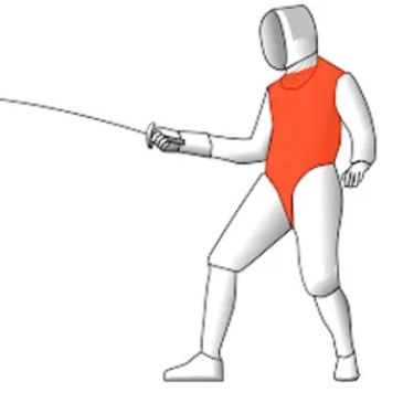 The valid target area is the torso, from the shoulders to the groin, front and back. It does not include the arms, neck, head or legs. Touches are scored similar to epée by using the tip o